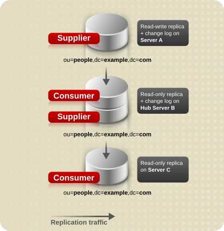 In a cascading replication scenario, one server, a hub, acts both as a consumer and a supplier. It holds a read-only replica and maintains a changelog, so it receives updates from the supplier server that holds the master copy of the data and, in turn, supplies those updates to the consumer. Cascading replication is very useful for balancing heavy traffic loads or to keep master servers based locally in geographically-distributed environments.