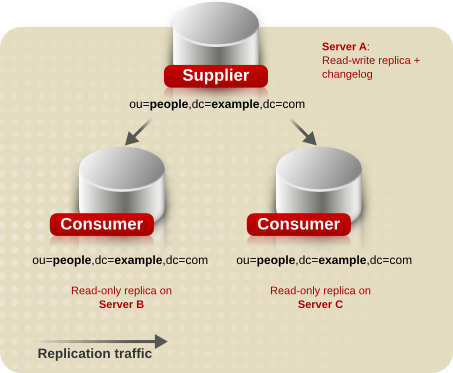In the simplest replication scenario, the master copy of directory data is held in a single read-write replica on one server called the supplier server. The supplier server also maintains changelog for this replica. On another server, called the consumer server, there can be multiple read-only replicas. Such scenarios are called single-master configurations. Figure 8.1, “Single-Master Replication” shows an example of single-master replication.