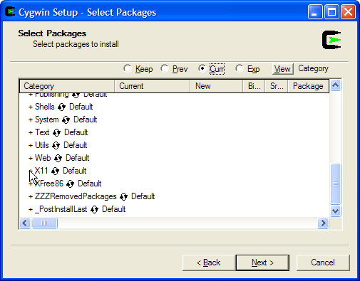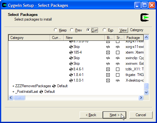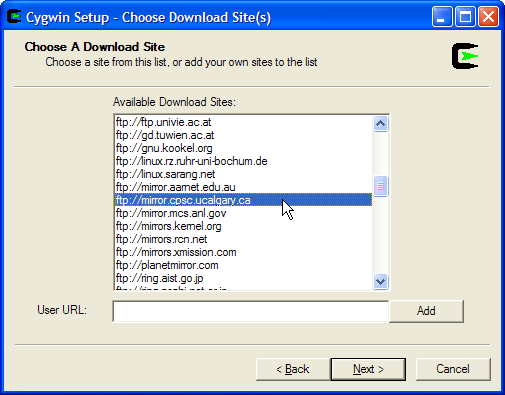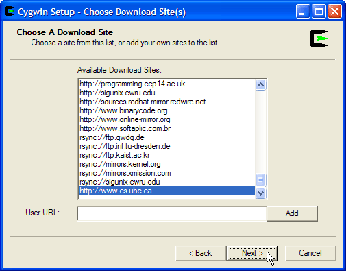 Aggiungete il package memorizzato nel server indicato. NB: Il server da inserire nella casella di testo non si ritrova tra quelli elencati ma va aggiunto manualmente, digitando http://www.cs.ubc.ca/local/software/cygwin