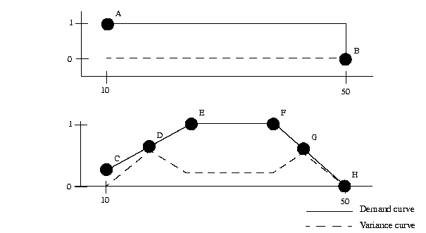 The individual curve is a piecewise linear curve represented by a set of points each of which have a time point and a demand. Optionally a point may represent a variance curve as well as the demand curve. The curves may be discontinuous, in which case the point representing the discontinuity must explicitly contain its magnitude and direction (that is, positive or negative). For example, the following figure represents two individual curves. The values of each of the data points (A through H) are listed in the table that follows.
