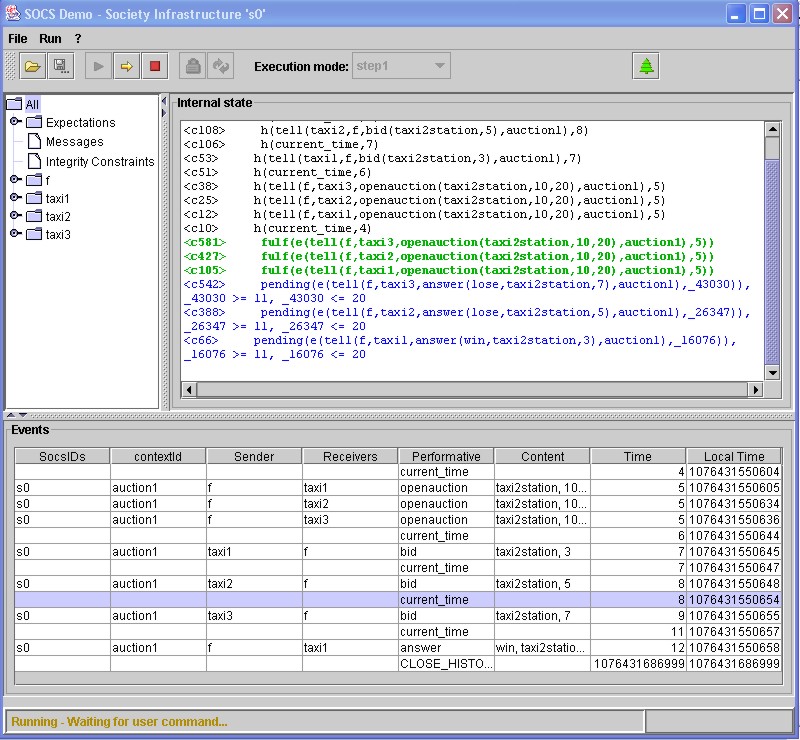 This page illustrates a storyboard of the SOCS-SI demo to be presented at AAMAS 2004. The examples are based on the "first price sealed bid" auction, whose protocol definition is presented later in this page.