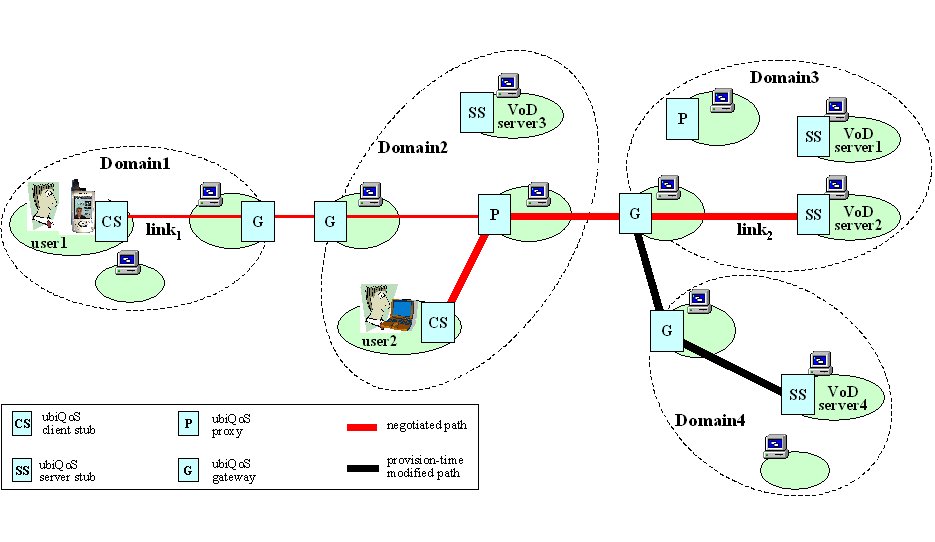The service provision scenario of Figure 1 shows how the different ubiQoS components cooperate to tailor and adapt the QoS of VoD flows. At negotiation time ubiQoS components dynamically distribute on the hosts along the VoD path. The different QoS requirements of user1 and user2 (and of their access devices) have suggested a high-quality flow to the VoD server and its scaling down at the ubiQoS proxy in domain2. At provision time, in case of degradation of link1 bandwidth, after the coordination of ubiQoS components in domain1 and domain2, the same ubiQoS proxy adapts the VoD transmission for user1 by reducing the frame resolution according to the receiver preferences profile. If there are no resources to adapt QoS by respecting negotiated requirements, e.g., in case of failure of link2, a new VoD path segment can ultimately be established. The ubiQoS gateway in domain3 launches a discovery for a suitable VoD server in its near domains, then negotiates with new ubiQoS-enabled hosts, and finally restarts the flow transmission, from the point in which it was interrupted (if server4 can support random-access to that VoD content). Apart from the time interval to establish the new VoD path, the server swap can be transparent to the receiver and to the other intermediate ubiQoS components.